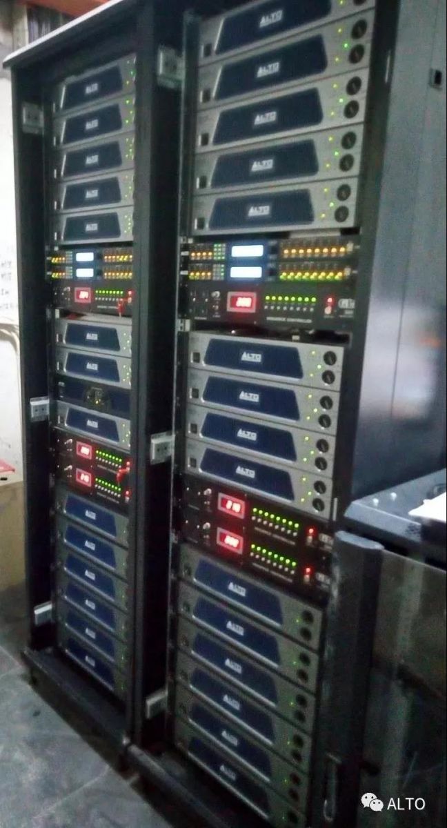 前面的两组主扬声器设计是按DJ台中间的跨度中线两边对开针对舞池的LR,这样舞池和散台的声压比例调制一致,Sxa30/30s线声源扬声器(8+2组合分二组)其角度可达水平覆盖100°垂直7°,强调的是立体声的宽度,后场区域应用Alto Bls315+点声源扬声器两只组合覆盖角度60*40°水平吊装,考虑到外围vip卡座20个,能让玩家每个角落体验到直到声,采用了At3000扬声器20只,所以我们采用了16个输入通道,32个通道输出来实现这个方案,出来的效果是惊人的!